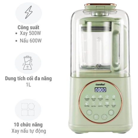 Máy làm sữa hạt Comfee CBL-50HGBHA0 thiết kế đẹp mắt, bảng điều khiển cảm ứng hiện đại, giao diện tiếng Việt dễ sử dụng. Công suất xay 500W và nấu 600W cùng lưỡi dao 6 cánh inox không gỉ giúp xay nhanh nấu khoẻ, đem đến thành phẩm thơm ngon sánh mịn. Dung tích 1 lít phù hợp với nhiều gia đình. Chất liệu cối thuỷ tinh cao cấp, chịu nhiệt tốt và độ bền cao. Với 10 chức năng tự động, bạn dễ dàng chế biến được nhiều món ngon cho gia đình bên cạnh nấu sữa hạt. Đặc biệt có chức năng làm sạch bằng nước nóng, đảm bảo an toàn, vệ sinh.